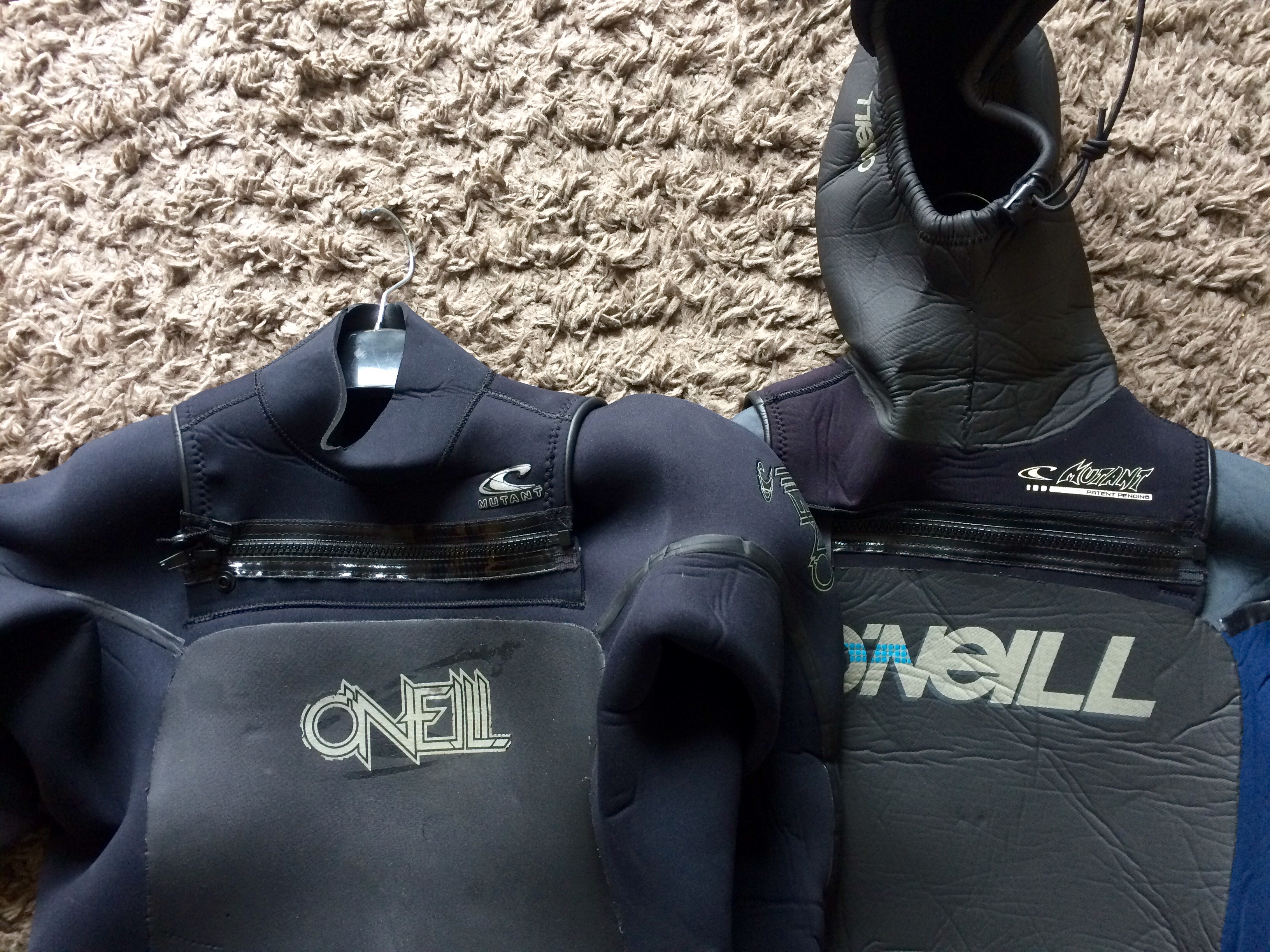 O'Neill Mutant 5/4mm. Interchangeable collar allowing you to switch from built in hood or not (see photo). Chest zip - Wearing at the knees but still warm £50