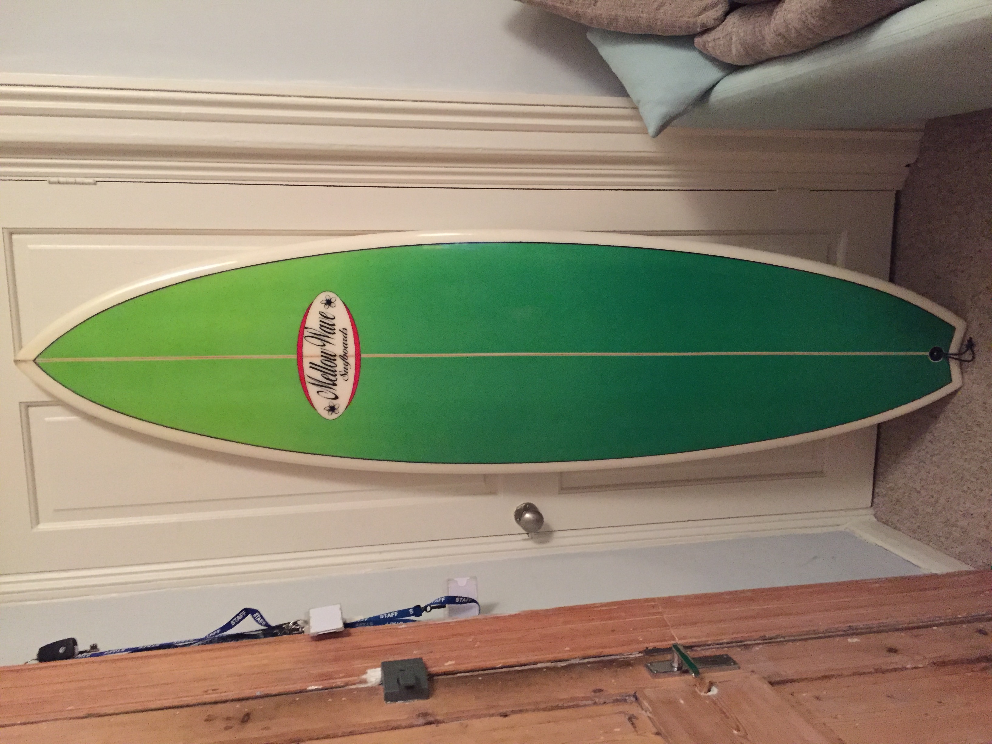 It is less than a year old and was shaped in Bude by Steve James at Mellow Wave. The dimensions are: 6'4" x 201/2 x 27/8. It has a few pressure marks on the deck, and it had a little bash on the nose which has been professionally fixed. It has good volume and rides beautifully.